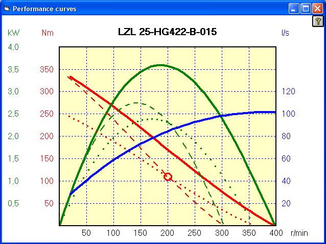 Exempel på motorkurvor med inlagd arbetspunkt. Prickade kurvor avser reglering till arbetspunkten med hjälp av tryckreglering.