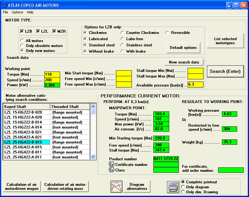 Program AIRMOTOR har utvecklats på uppdrag från Atlas Copco Tools AB. Programmet kan användas för val av lämplig luftmotor med hänsyn till önskade prestanda. Kan även användas som motorkatalog. Programmet innehåller prestandadata, motorkurvor och måttskisser.