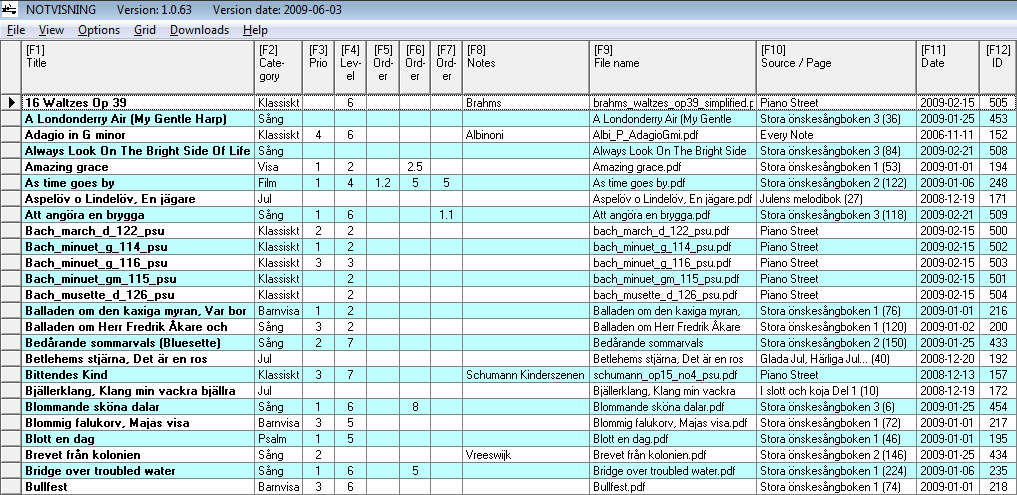 sökningar. Alla noter kan mycket snabbt hittas och visas. Om så önskas kan visningsordning