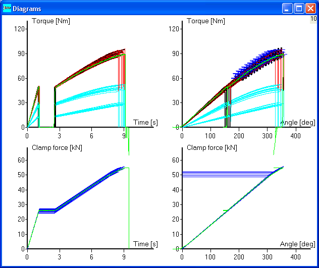 Clamp force=f(Time), Clamp force=f(Angle). You will also get a table with the result of every single tightening,